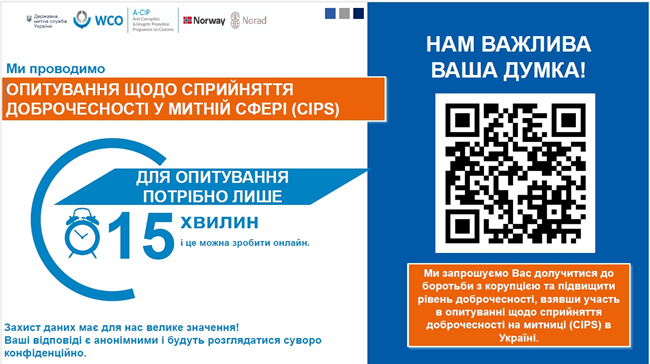 З метою підвищення прозорості, доброчесності та ефективності роботи митних органів, Державна митна служба України у партнерстві з Програмою Всесвітньої митної організації (ВМО/WCO) з протидії корупції та сприяння доброчесності (A-CIP Programme) організовує онлайн-опитування «Оцінка сприйняття доброчесності в митній службі України» (Customs Integrity Perception Survey – CIPS), яке відбудеться з 15 по 30 вересня 2025 року.