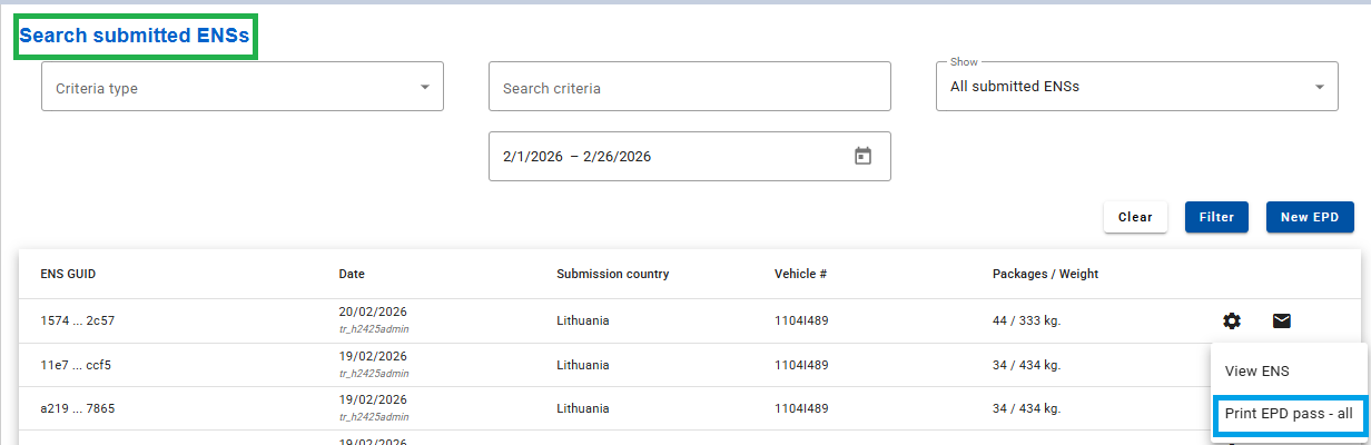 1. ENS Pass доданий разом з EPD Pass в функцію «Print EPD passall». Доступно з розділів Search Submitted EPDs (пошук направлених EPD) та Search Submitted ENSs (пошук направлених ENS).
